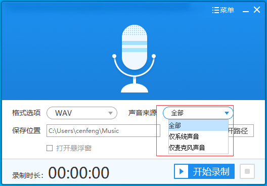 3、在录制之前可以选择录制的声音来源,声音来源分为全部(系统+麦克风)、仅系统声音和仅麦克风声音,根据需要选择一种声音来源录制。