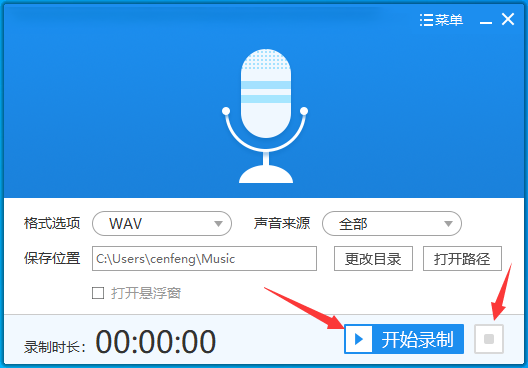 5、最后点击开始录制按钮就可以根据设置的参数录制音频了,录制好后点击右侧的矩形框就可以结束录制并把音频存储在预设的输出路径中。