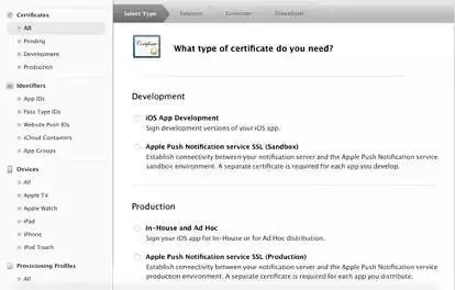 证书分成开发证书和发布证书,其中有没有推送功能又是不同的,根据实际应用的功能选择证书的种类: