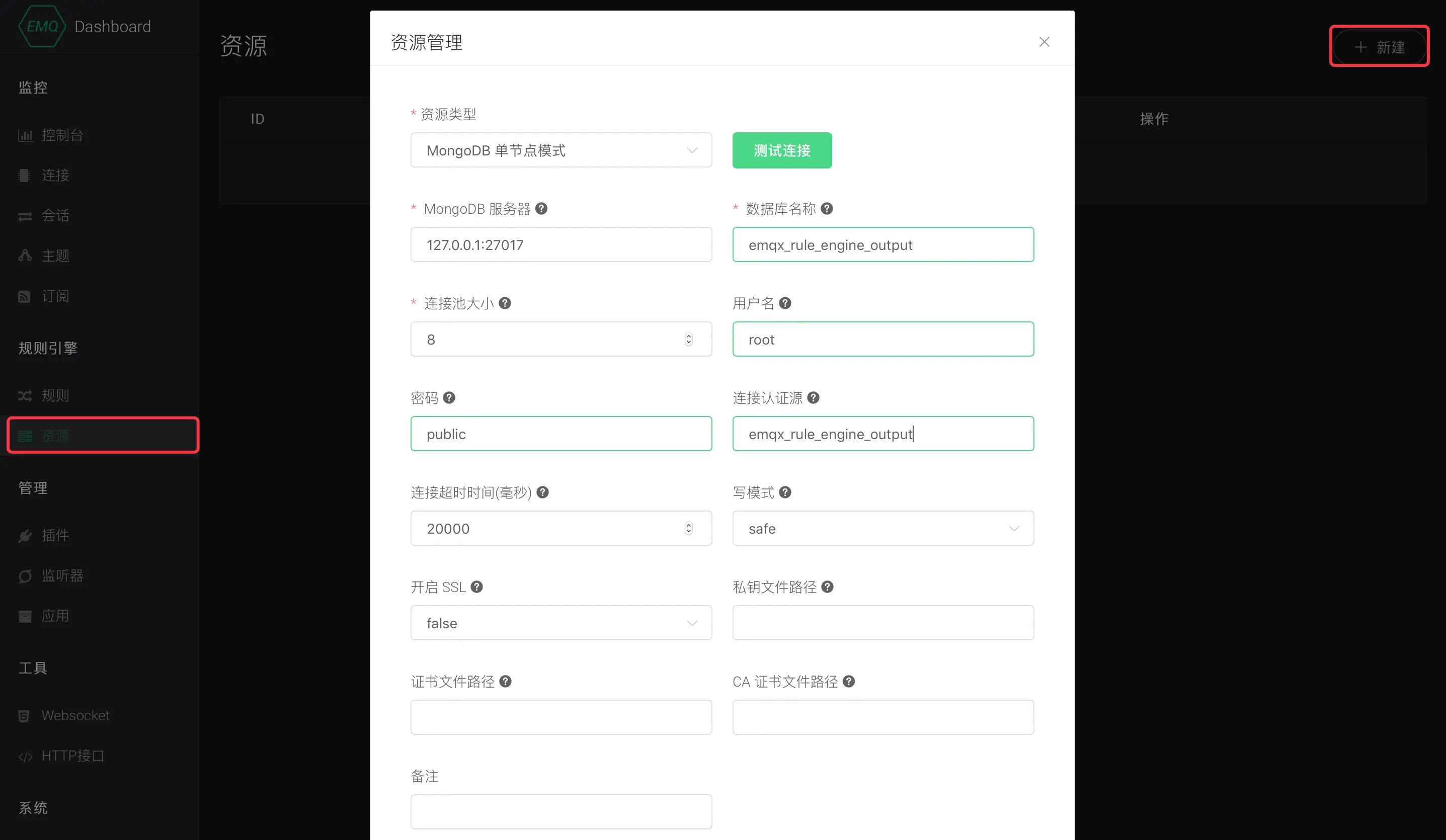打开 EMQ X Dashboard,进入左侧菜单的 资源 页面,点击 新建 按钮,选择 MongoDB 资源类型进行创建:
