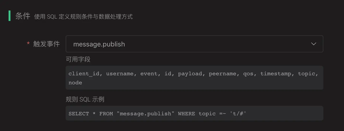 规则引擎使用 SQL 语句处理规则条件,该业务中我们需要将 payload 中所有字段单独选择出来,使用 payload.<fieldName> 格式进行选择,还需要消息上下文的 topic、qos、id 信息,当前 SQL 如下: