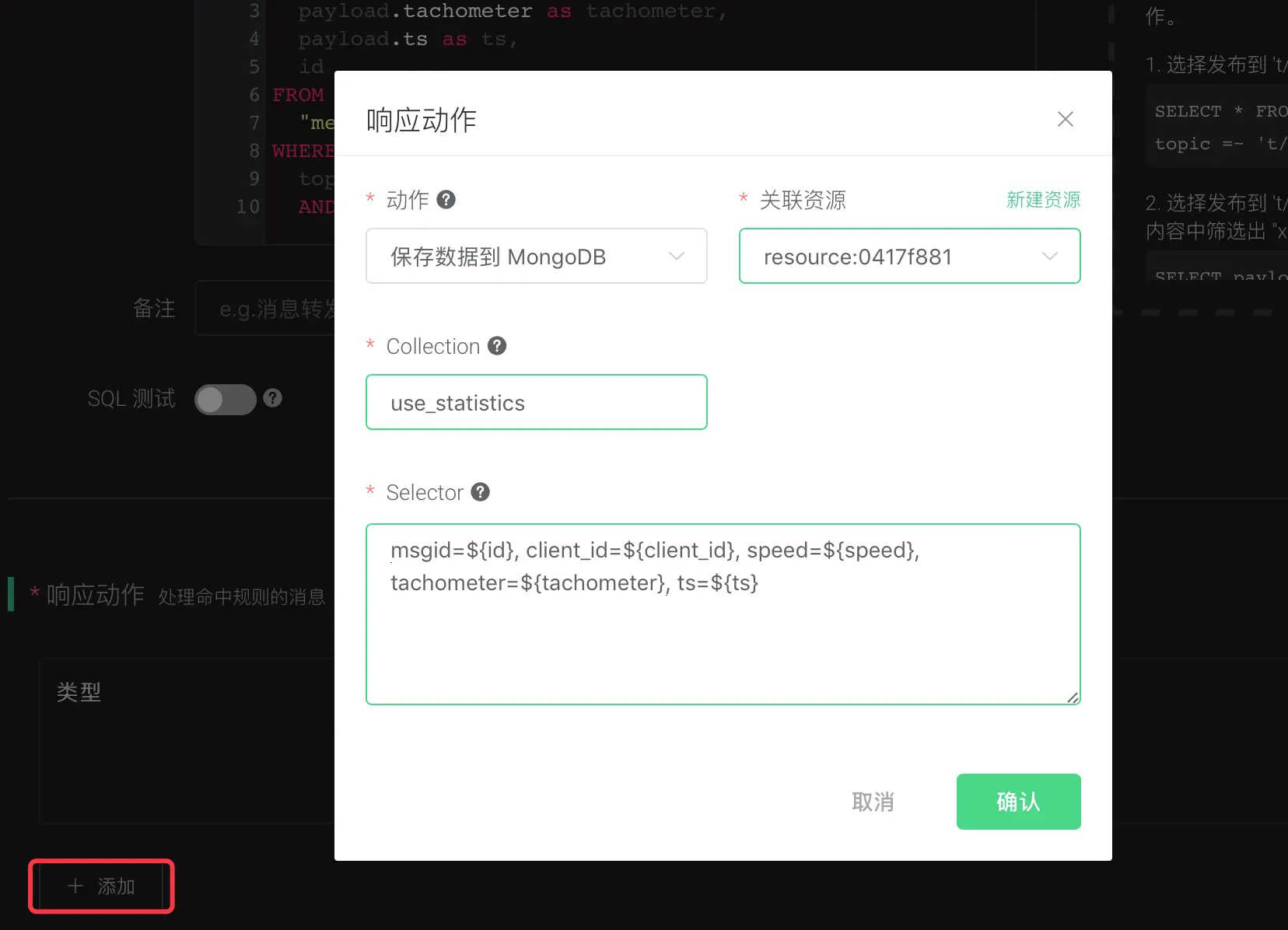 SQL 条件输入输出无误后,我们继续添加响应动作,配置写入 SQL 语句,将筛选结果存储到 MongoDB。