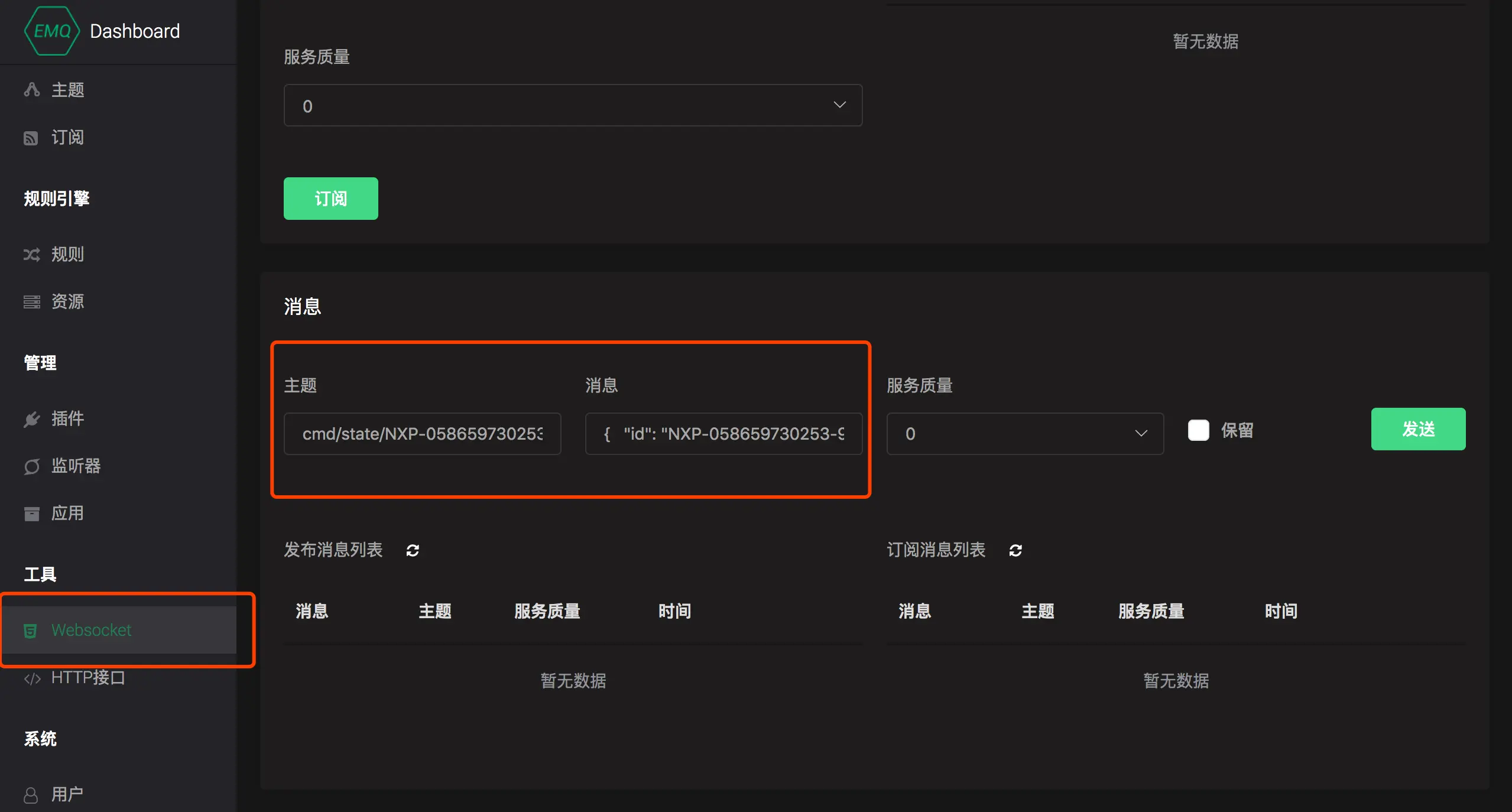切换到 工具 => Websocket 页面,使用任意信息客户端连接到 EMQ X,连接成功后在 消息 卡片发送如下信息: