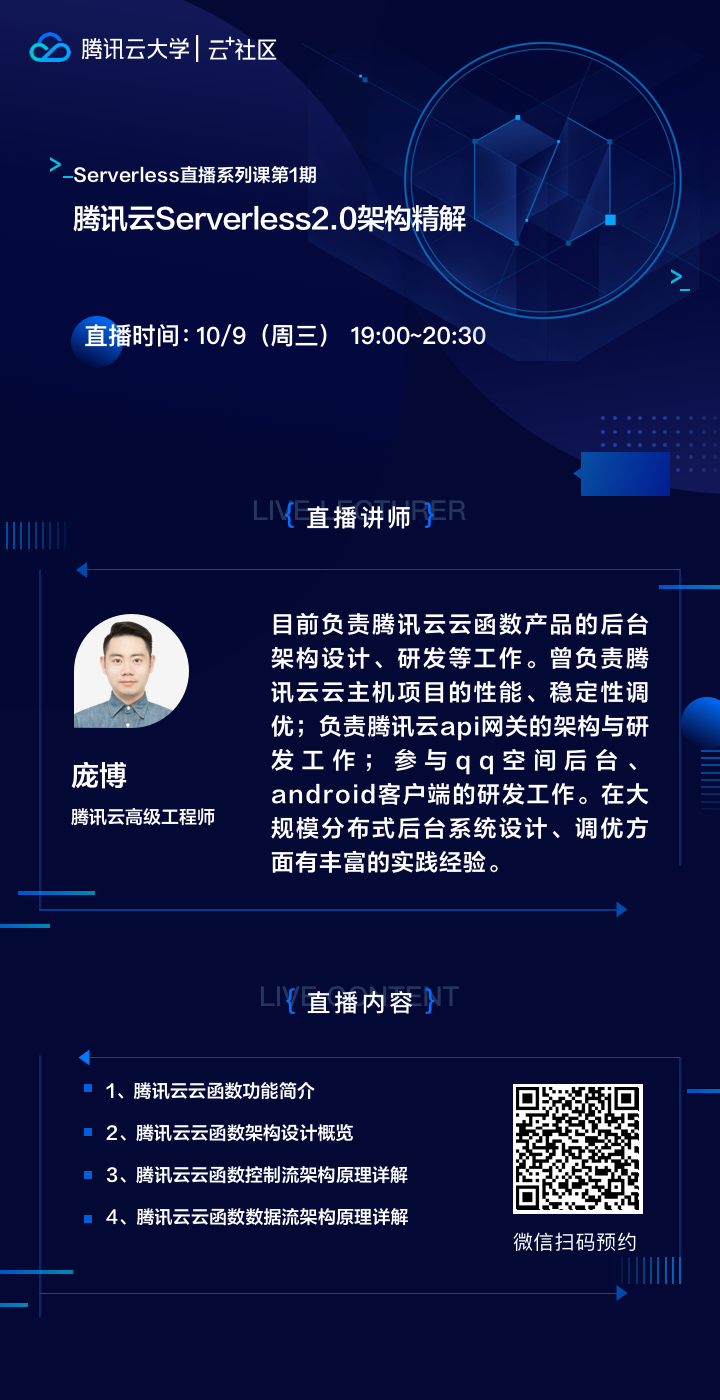 在10月9日的大咖直播课中,我们邀请了腾讯云高级工程师庞博,以腾讯云云函数SCF为例,讲解云函数架构的实现。