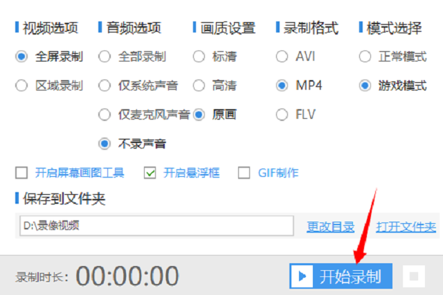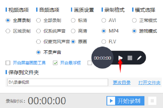 2、然后打开这个工具,屏幕上会出现一个面板,上面有录屏功能。在录制游戏之前要先设置录制的参数,有视频音频、画质、格式和模式。这里视频最好选择全屏录制、画质选择原画画质、模式则选择游戏模式。