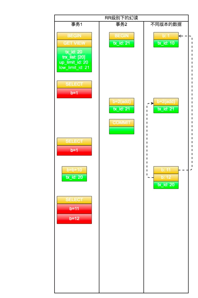 当然在RR隔离级别下面也同样会出现不可重复读的情况。我们依然根据那张tran表,初始值还是(a=1,b=1),来看下面的例子: