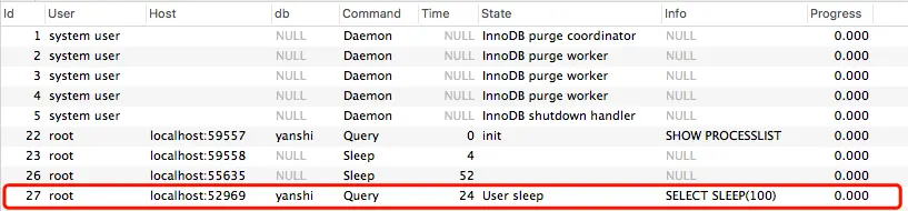 有时候,慢查询还在进行,但数据库负载已经偏高了,这时候可以用 show processlist 来找出慢查询。 如果有PROCESS权限,可以看到在执行的语句。如果没有则只能看到本次会话中的执行语句。