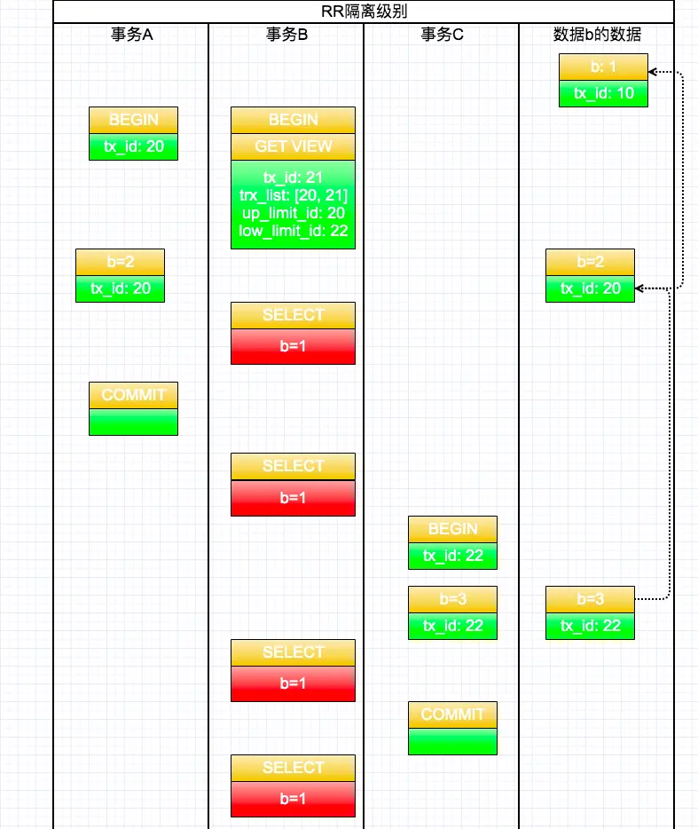 我们再来分析一下RC隔离级别,RC隔离级别和RR隔离级别判断逻辑是一致的,唯一区别是,RR隔离级别在事务开始的时候生成"Read-View", 而RC隔离级别是在每次“SELECT”语句时生成"Read-View"。