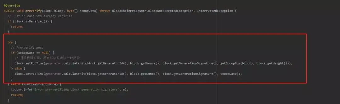 - 在节点收到P2P网络中的历史区块,抑或是收到矿工广播的铸造区块时,首先要对区块进行preVerify操作,此处在调用者提交的参数中,scoopData总是空值,因为在burstCoin所使用的数据存储中,block的字段没有存储scoopData。那又是如何完成验证?