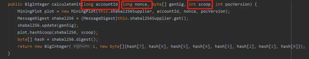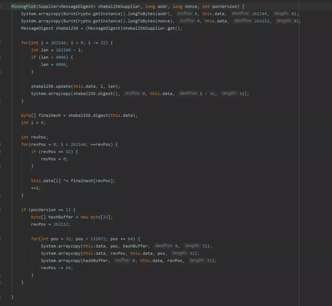 - 答案就在calculateHit这一方法之中,BurstCoin将其节点的一部分功能方法放到了burstKit的单独jar包中,找到其计算calculateHit方法后,我们发现,其调用了MiningPlot的初始化方法。