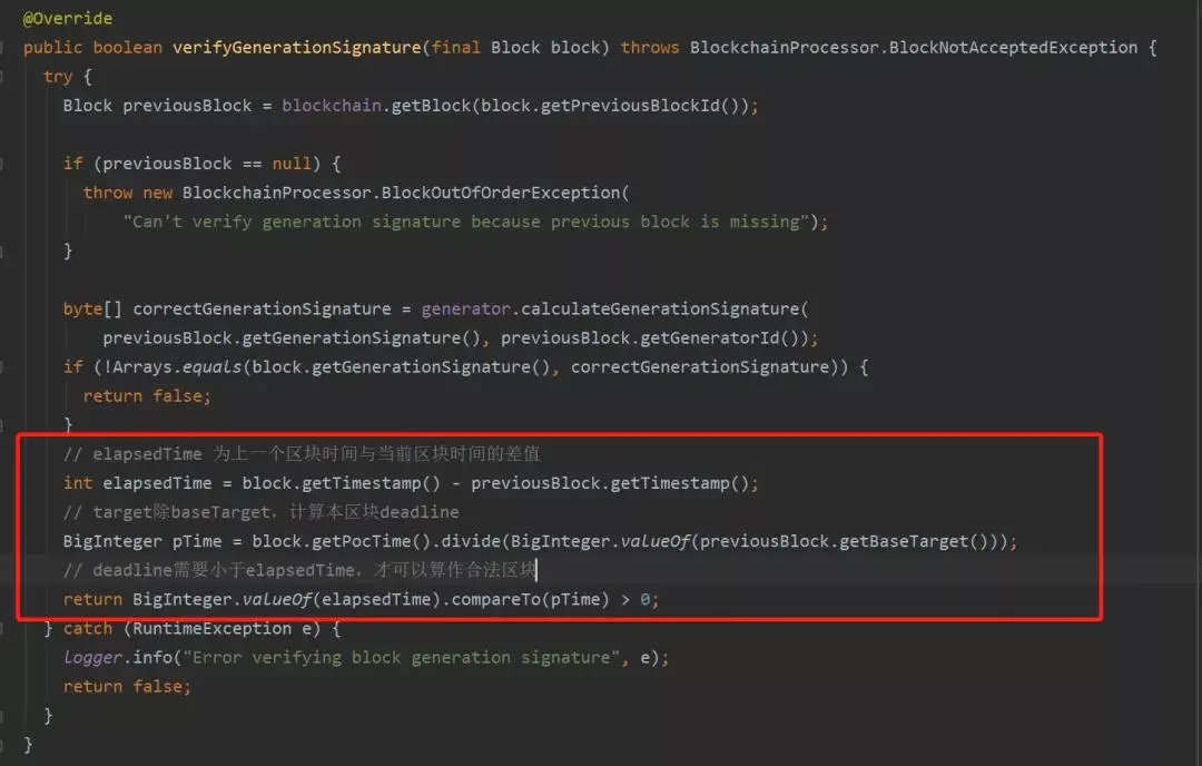 一般其与真正的UTC时间之间允许有1-2小时误差。同时,BurstCoin的特殊性在于,区块是否成功上链与其计算得出的deadline直接相关。故我们在BurstCoin源码中可以找到如下的校验过程: