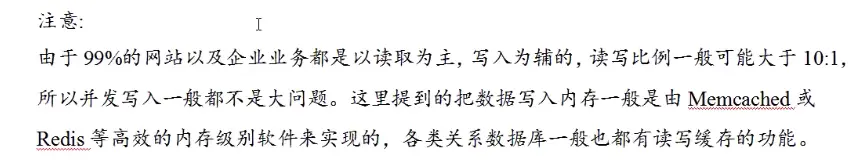99% 的网站都是以读取为主,写入为辅,读写比可能大于 10:1,所以并发写一般不是大问题。数据写入内存一般是通过:Memcached、Redis等高效的内存级别软件实现的,关系型数据库一般也有读写缓存