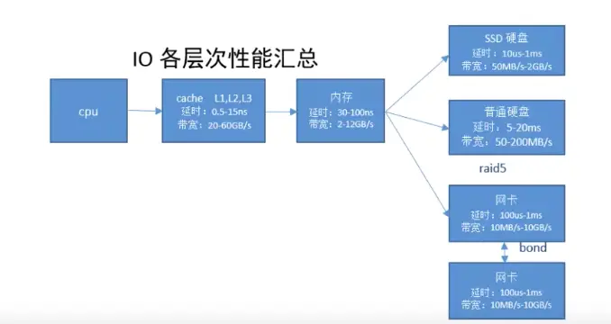 cpu的速度是最块的了,比内存都快1000倍,好比你和3岁小孩比赛跑,这那能玩到一块去呀,所以在cpu和内存之间加上了3级缓存,这3级缓存是封装在cpu内部的- 大家算算从高速缓存->内存->SSD->机械硬盘之间的带宽(每秒读写速度),延迟之间的差距,就能理解很多时候大厂搭建服务器的思路了