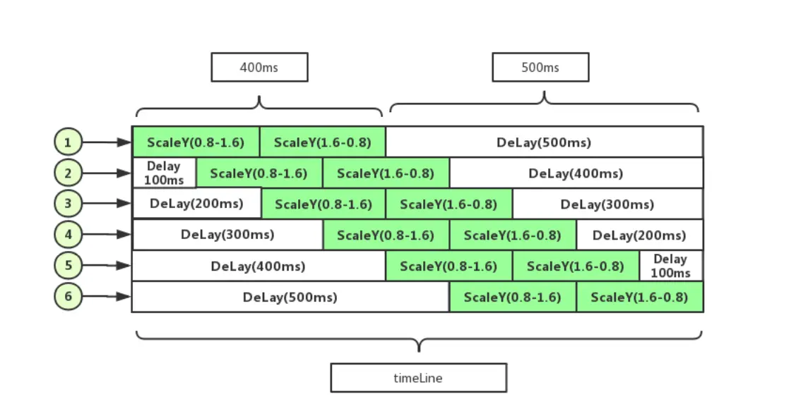 - 通过ScaleY组件有序的进行放大和缩小的操作,让每个矩形都有波浪的效果