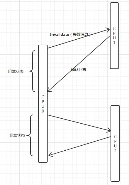 小黄:MESI优化带来了可见性的问题:MESI 协议虽然可以实现缓存的一致性,但是也会存在一些问题。就是各个 CPU 缓存行的状态是通过消息传递来进行的。如果 CPU0 要对一个在缓存中共享的变量进行写入,首先需要发送一个失效的消息给到其他缓存了该数据的 CPU。并且要等到他们的确认回执。CPU0 在这段时间内都会处于阻塞状态。