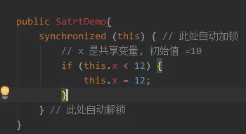 假设 x 的初始值是 10,线程 A 执行完代码块后 x 的值会变成 12(执 行完自动释放锁),线程 B 进入代码块时,能够看到线程 A 对 x 的写操作,也就是线程 B 能够看到 x==12。