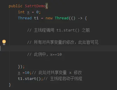 start 规则,如果线程 A 执行操作 ThreadB.start(),那么线程 A 的 ThreadB.start()操作 happens-before 线程 B 中的任意操作