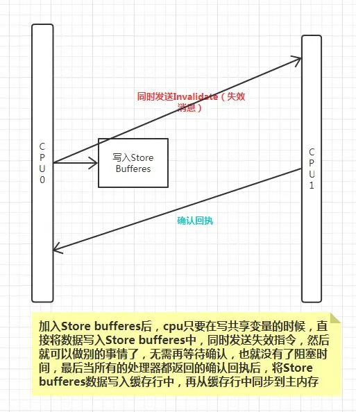 CPU0 只需要在写入共享数据时,直接把数据写入到 store bufferes 中同时发送 invalidate 消息,然后继续去处理其他指令。当收到其他所有 CPU 发送了 invalidate acknowledge 消息时,再将 store bufferes 中的数据数据存储至 cache line中。最后再从缓存行同步到主内存。