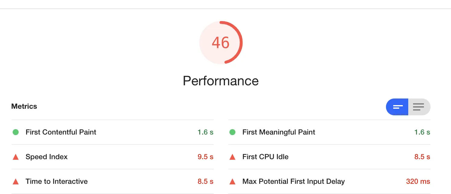 Lighthouse是针对网站性能,SEO等很多指标进行测试的谷歌的开源软件,他可以模拟不同的网络环境对网站进行全面的指标收集,同时也会给你的网站提供一些优化的建议,你也可以在chrome->开发工具->Audits下使用他。类似的性能测试网站或者工具也有很多你可以在之前写的性能指标这篇文章中了解。由于网站还没有上线无法对真实的用户环境性能进行收集,这里就只针对开发环境性能工具进行一些环境模拟的数据收集。