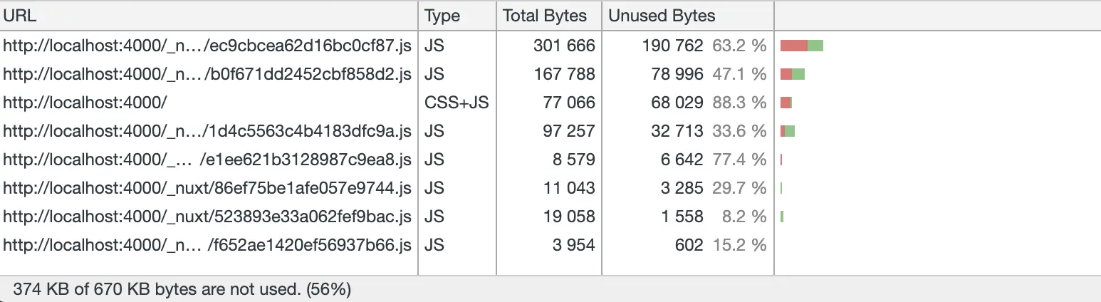 还有一个重要的指标是页面的代码使用率(coverage),你也可以在chrome的开发工具->coverage测试这个指标,coverage标志着当前页面的js有多少是当前页面真正需要执行的,你可能只是使用了UI库的一个组件但是把整个UI库全部都打包了进来,你也通过tree sharking避免这种情况(现代浏览器javascript性能优化),如果你发现你的code coverage没有使用的代码比例比较高的话,你就要考虑是不是有可能你把不需要的代码都打包进来了。如果你使用webpack打包js,你可以使用Webpack Bundle Analyzer来分析你的js包文件。 这次优化的首页他的code coverage: