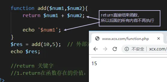 2、return还可以在文件中直接使用(不在函数里面):代表将文件结果return后面跟的内容,转交给包含当前文件的位置(通常在系统配置文件中使用较多),在文件中也代表终止文件后面的代码:return 之后的内容不会执行