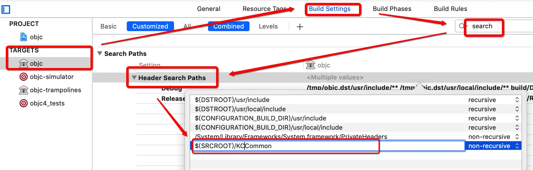 Header Serach Paths中添加搜索路径$(SRCROOT)/KCCommon