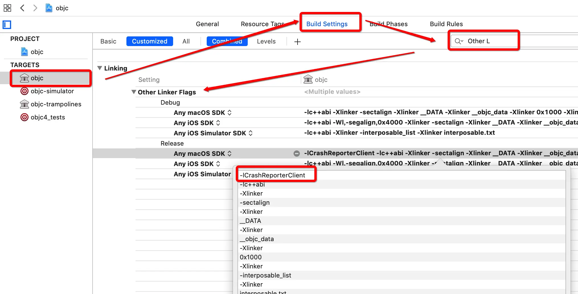 Other Linker Flags中删除-lCrashReporterClient(Debug和Release都删了)