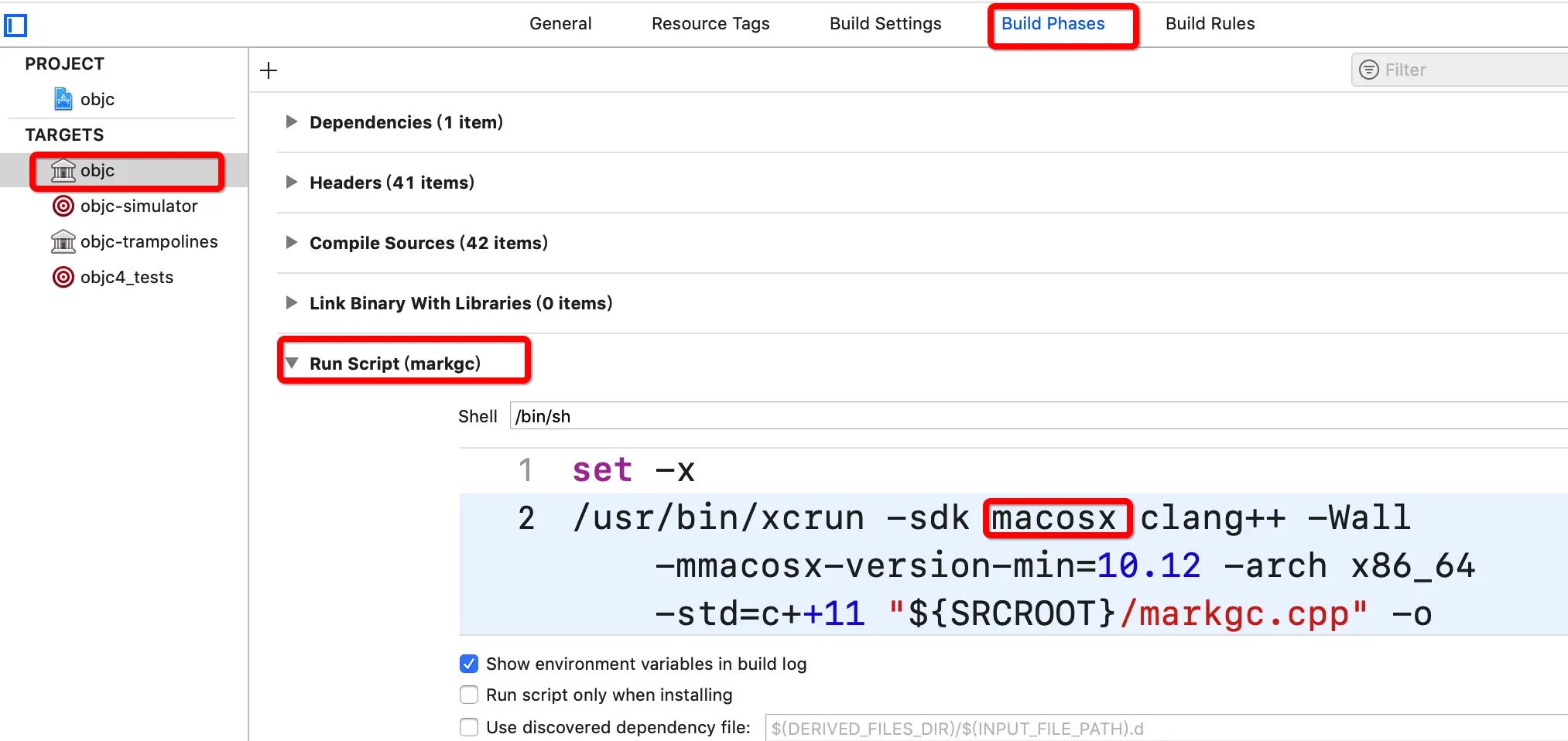 target->objc->Build Phases->Run Script(markgc) - 把脚本文本