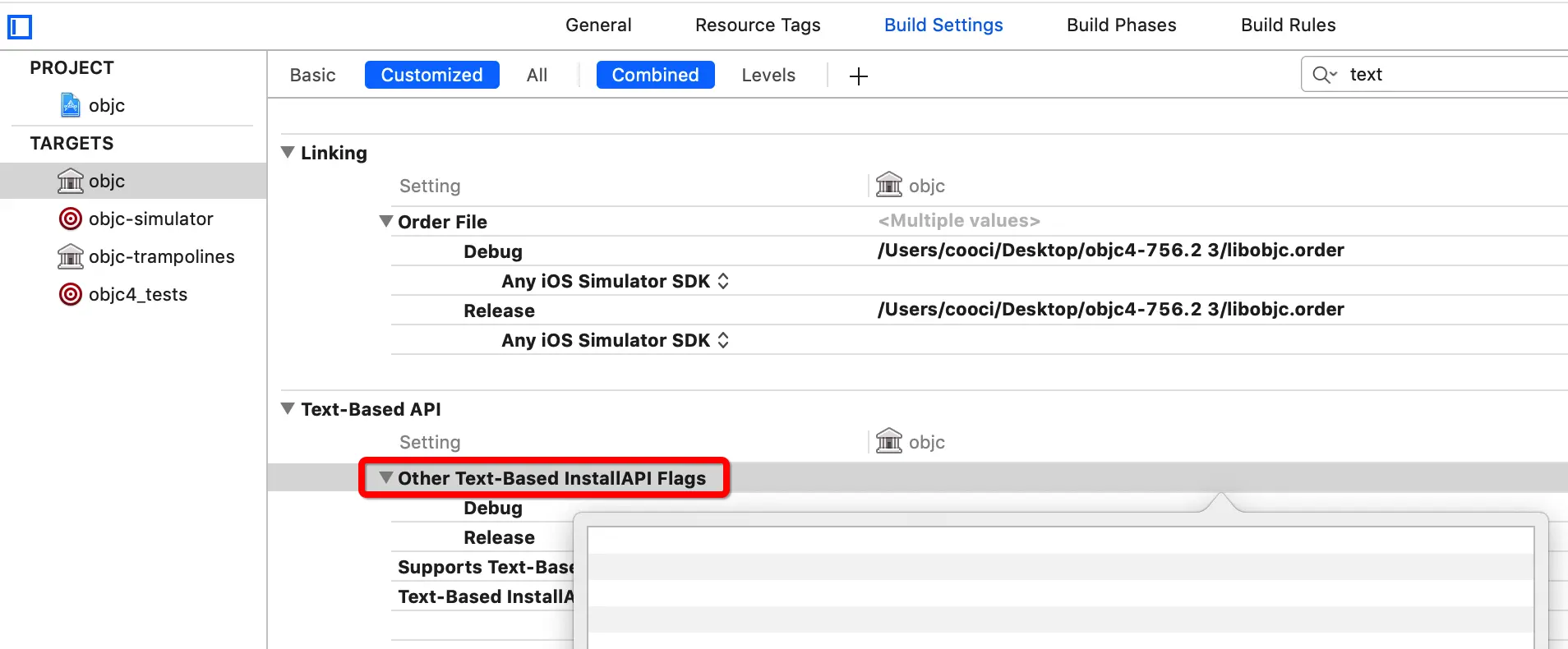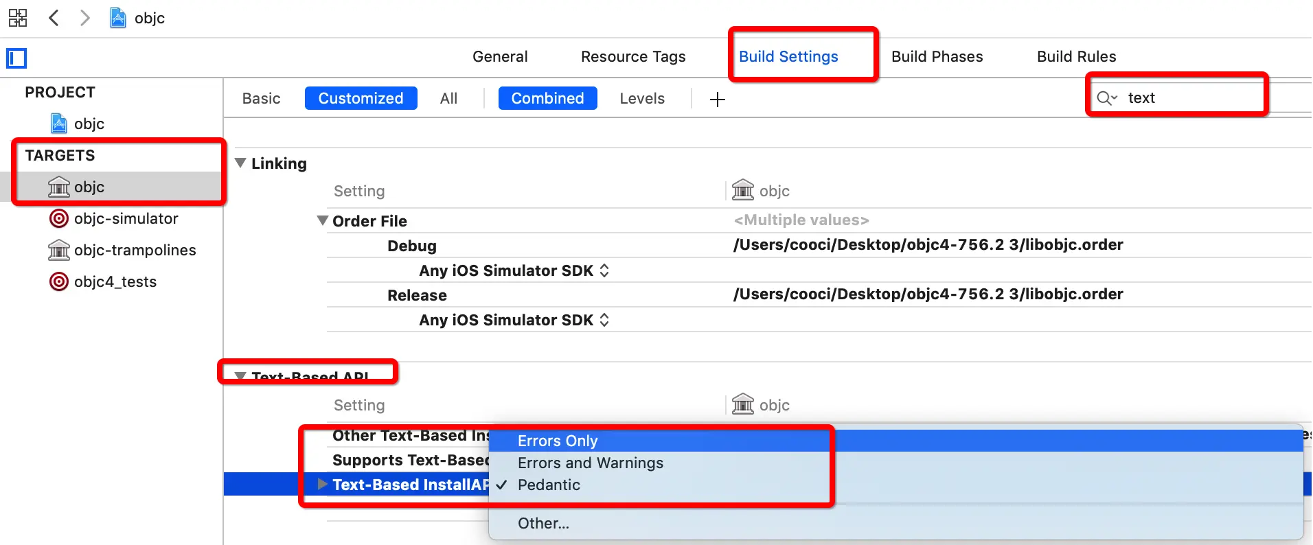 target->objc->Build Settings Text-Based InstallAPI Verification Model中添加搜索路径Errors Only