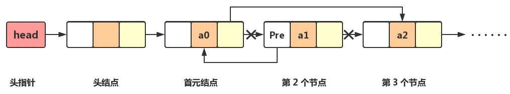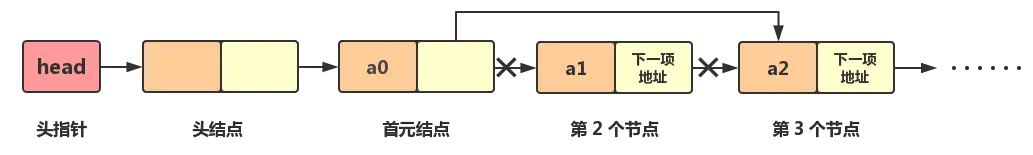 对应图中的节点,想要删除第2个节点 a1 只需要 将首元结点的指针指向到第三个节点的地址去