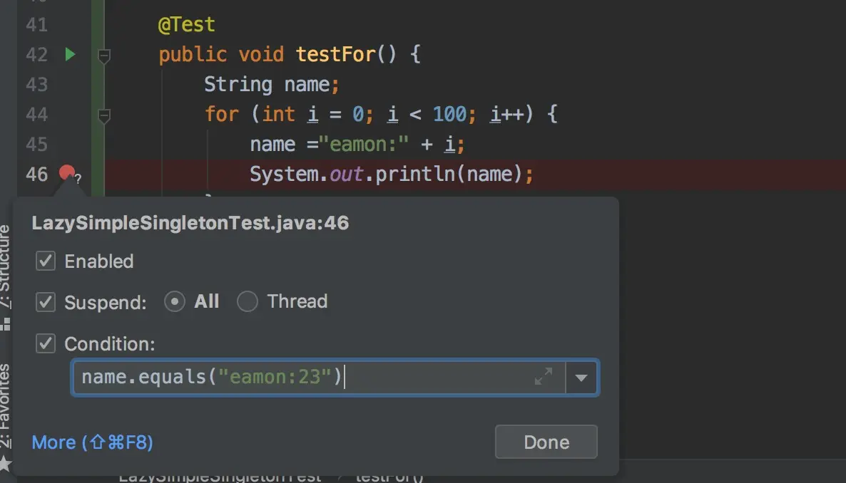 我们说过,IDEA中的debug功能是非常强大的,要使用条件断点也非常简单,下面这张图片中 Condition中的内容代表当name为eamon:23时,程序执行到断点处停下来。