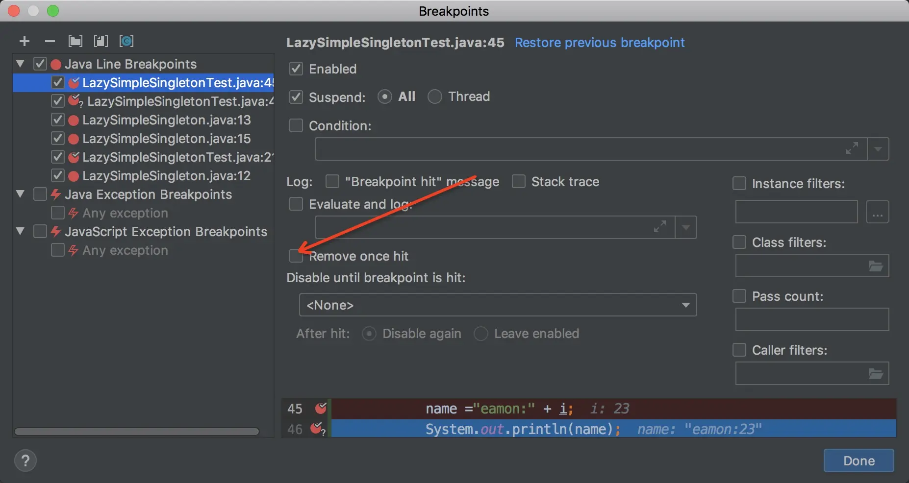 临时断点可以通过在打断点时按住 Alt 或者 option 键,然后创建断点。也可以通过右键断点处,选择 more 然后在窗口中选中 Remove once hit