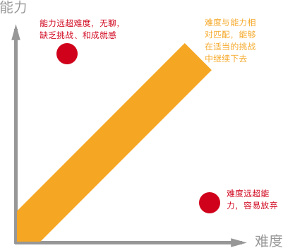 最后,我想结合最近在一次培训中讲到的,难度与能力的匹配度问题,如下图:当难度与能力有一个合适的匹配时,用户是最容易继续下去的。两个极端情况,都不合适。