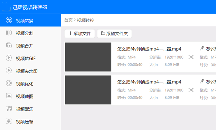 1、首先就是点击视频转换,然后把需要提取音频文件的mp4视频导入到迅捷视频转换器当中,点击软件左上边的添加文件当然也可以点击添加文件夹按钮,然后将mp4添加到软件中。