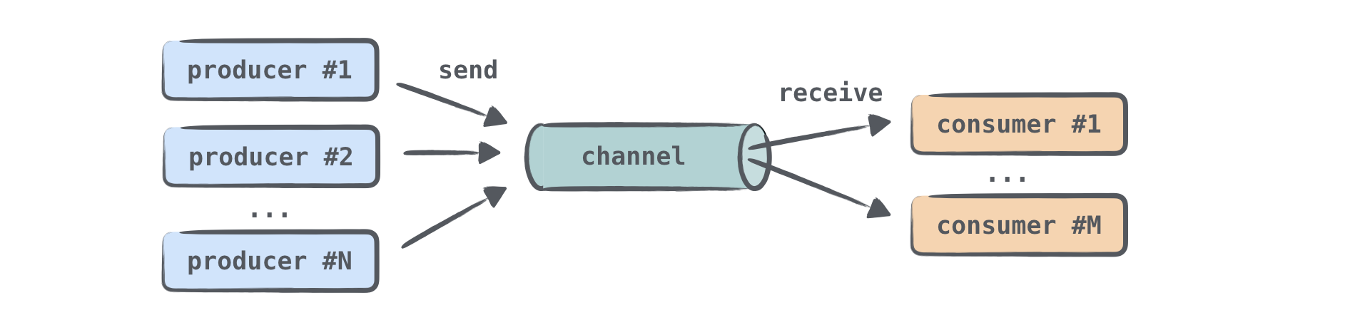 发送(产生)信息的协程通常被称为生产者,而接收(消费)信息的协程被称为消费者。 在需要时,许多协程可以将信息发送到同一channel,许多协程也可以从该channel接收信息: