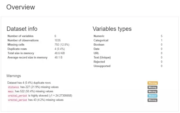 pd.read_csv('https://raw.githubusercontent.com/mwaskom/seaborn-data/master/planets.csv').profile_report()