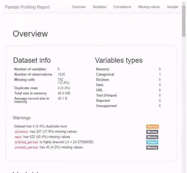 我们首先看到的是概述,其中提供了关于数据和变量的一些非常高级的统计信息,以及变量之间的高相关性、高偏态性的警告等。