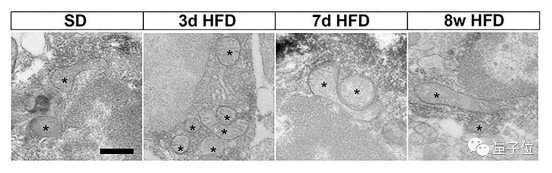 如果看一下显微镜下的图片会更清晰,每个星号都标注了一个线粒体,数量变化很明显。