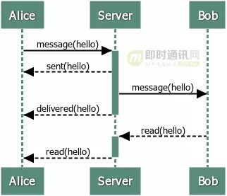 1)向Alice发送一个sent(hello)表示消息已经被发送到服务器: