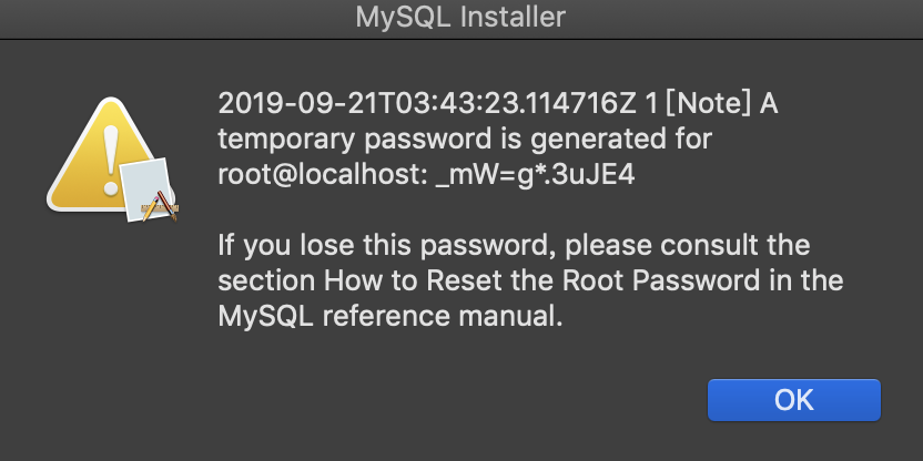 10.14 没有自带MySQL,需要我们自己安装。这里只介绍最简单的方式,到MySQL官网下载最新的dmg安装包,我本人下载的是mysql-5.7.11-osx10.10-x86_64.dmg。进入下载页面后,会提示你登陆或注册,这里不必理会,直接点击底部的“No thanks, just start my download.”即可开始下载。 双击下载的dmg安装,一直下一步安装,最后安装完成后会弹出一个提示,告诉你MySQL为root@localhost账号生成了一个临时密码,务必将这个密码保存下来。