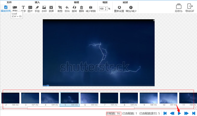 4、结束录制后界面会自动跳转到GIF编辑页,页面中会出现刚刚录制完成的视频素材。而这时这个素材也被转换成GIF格式,在下面可以看到它的帧数。