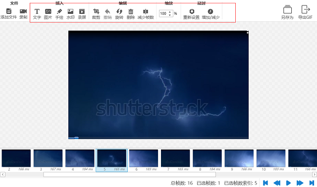 5、当然你也可以对GIF进行一些编辑操作。如添加字幕、添加图片、裁剪、减少帧数等。要用到的编辑工具可以在页面的上方工具栏中找到。