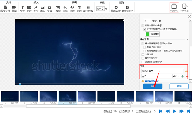 6、编辑完成后如果想要导出或者保存GIF图片的话点击一下页面右上角的“另存为”按钮,会出现一个设置页面,在里面设置一下文件保存的位置,然后点击“应用”即可保存GIF。