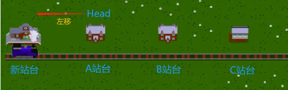 我们知道火车不可能平白无故的就在轨道上行驶的,从哪来,往哪去,那么它肯定得要有一个始发站(head),这个head就代表了链表的头,来决定了数据的访问是从哪里开始的,按照刚刚说的由于链表的数据是随机存储在内存里面,如果要访问数据,只能通过每个数据所包含的指针来逐个往下访问,现在通过上图来看,有ABC三个车站,我们看到火车的朝向是从左往右的,因此我们可以将A车站作为是始发站,如果火车要到达任意这三个车站,就需要修建一条能经过这三个站台的轨道,而这指针就如同铁轨一样,是连接的媒介,将三个站台(数据)连接起来。如果我们要去C站台(访问C的数据),只能先到A站台(第一个数据),然后再经过到B站台,最后才能到达C站台,去访问C的数据。