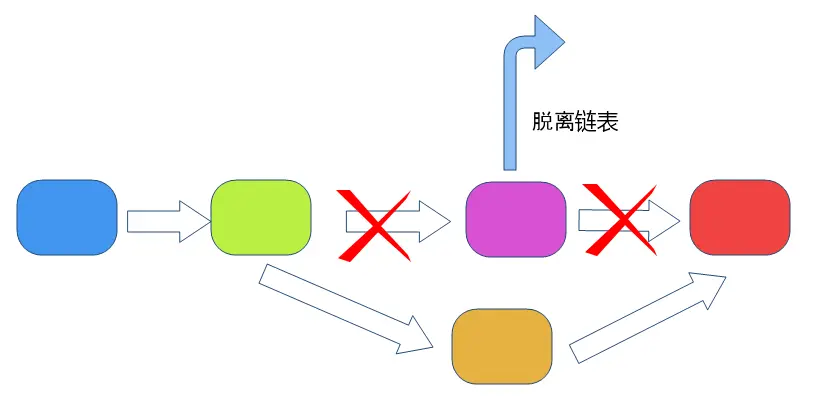 第二步,把待删除元素前一个元素的指针指向待删除元素的后一个元素。