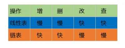 通过上面介绍的关于链表的增删改查,相信大家也对链表有了个大致的认识,我们可以看到链表数据的增加与删除还是属于便捷的,只需对指针进行操作即可,而不用像前一章(线性表)需要将后面的元素往后移来腾出空间安置新元素或者将后面的元素往前补来顶替被删除的元素。但是在查询或修改方面则显得比较麻烦,需要遍历整个链表才能找到目标元素,由此对比两种数据结构可得: