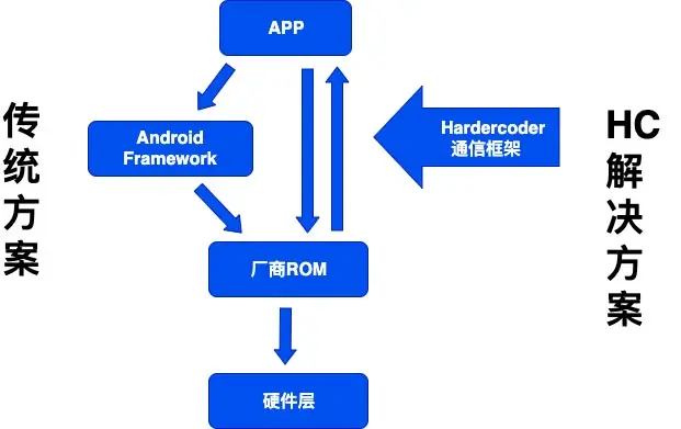 Hardcoder 构建了 APP 与系统(ROM)之间可靠的通信框架,突破了 APP 只能调用系统标准 API,无法直接调用系统底层硬件资源的问题,让 Android APP 和系统能实时通信。