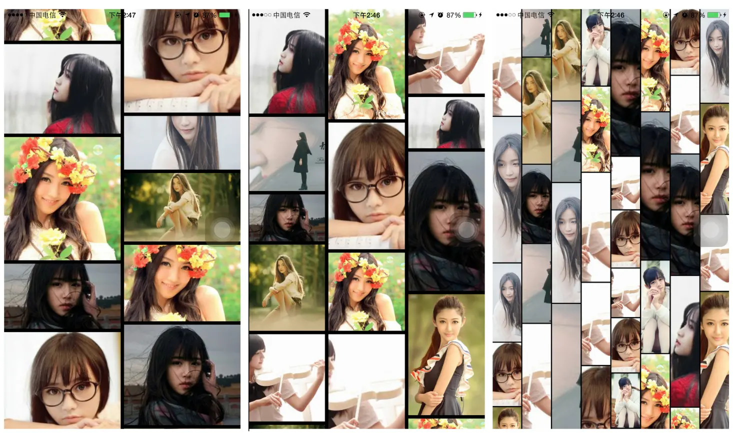 先来看一下不同配置参数下运行后的效果吧,每张截图的列数和Cell之间的边距都有所不同,瀑布流的列数依次为2,3,8。有密集恐惧证的童鞋就不要看这些运行效果图了,真的会看晕的。下面这些运行效果就是修改不同的配置参数来进行布局的。看图吧,关于瀑布流的效果就不啰嗦了。以下的效果就是使用自定义布局做的,接下来将会介绍一下其实现原理。