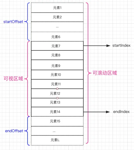 如上图,可视区域和可滚动区域已经介绍过,可视区域的确定是通过 startIndex 和 endIndex 来确定的,它们代表在总的列表项中的开始元素和结束元素。