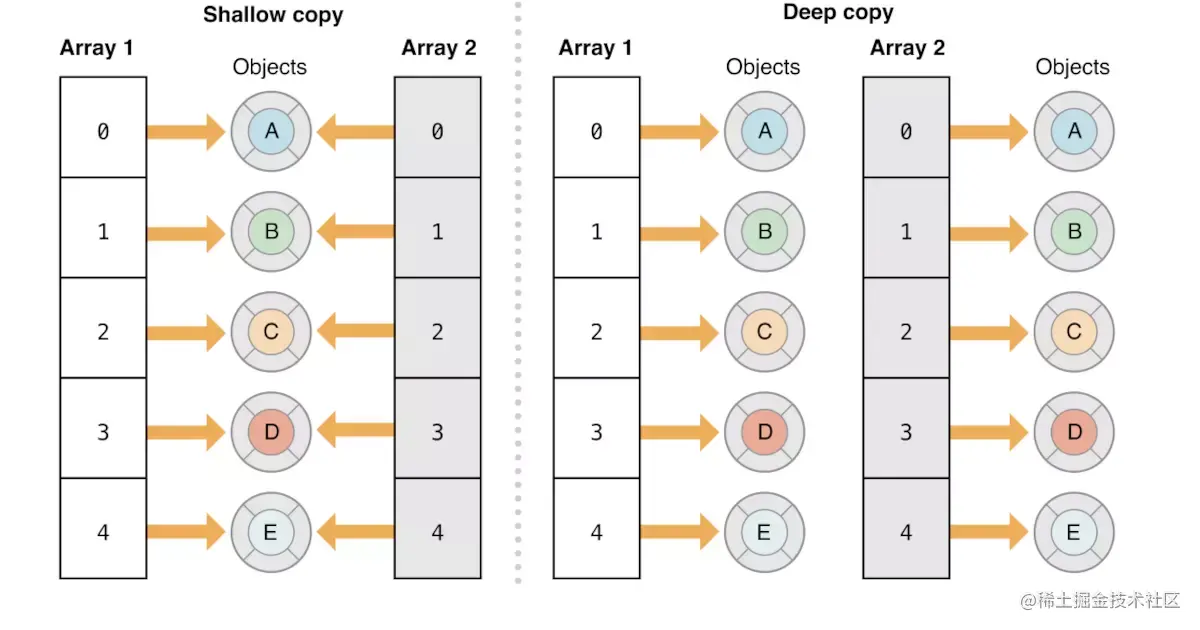 NSArray *array = @[[NSMutableString stringWithString:@"Hello"],@"World"]; // 未创建了新的容器(浅拷贝),容器内的元素是指针赋值 NSArray *copyArray = [array copy]; // 创建了新的容器(深拷贝),容器内的元素是指针赋值 NSMutableArray *mutableCopyArray = [array mutableCopy];